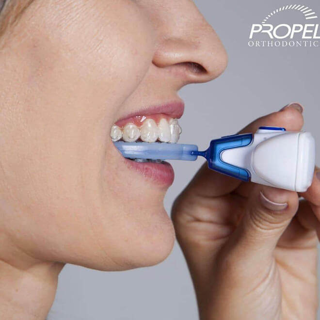 The Propel VPro5® uses micropulse therapy to speed up tooth movement. This is a safe, high-frequency vibration that increases blood flow around the treatment area to jump start your body’s healing process.